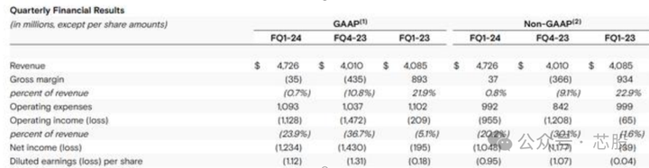 2024财年第一财季财报营收为47.3亿美元,相比于上个季度的40.1亿美元有所增长,环比增长了17.9%,高于市场45.4亿美元的预期,比起上一财年同期的40.9亿美元,同比增长了15.6%;净亏损约为12.3亿美。