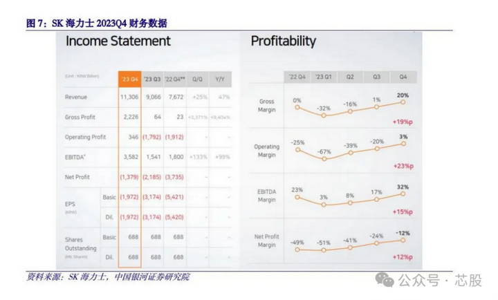 SK海力士于2023年1月25日发布2023Q4财报。单季度来看,2023年Q4实现收入11.31万亿韩元,同比增长47%,环比增长25%;毛利润为2.23万亿韩元,同比增长9404%,环比增长3371%;毛利率为20%,同比增加20pcts,环比增加19pcts;营业利润为0.35万亿韩元,去年同期为-1.91万亿韩元,同年上季度为-1.79万亿韩元;营业利润率为3%,同比增加28pcts;环比增加23pcts;EBITDA为3.58万亿韩元,同比增长99%,环比增长133%。2023Q4营收显著增长,原因是存储芯片市场复苏,AI服务器和移动应用程序的需求增加、平均售价(ASP)上升,此外,公司积极关注盈利能力,从而实现收入扭亏为盈。