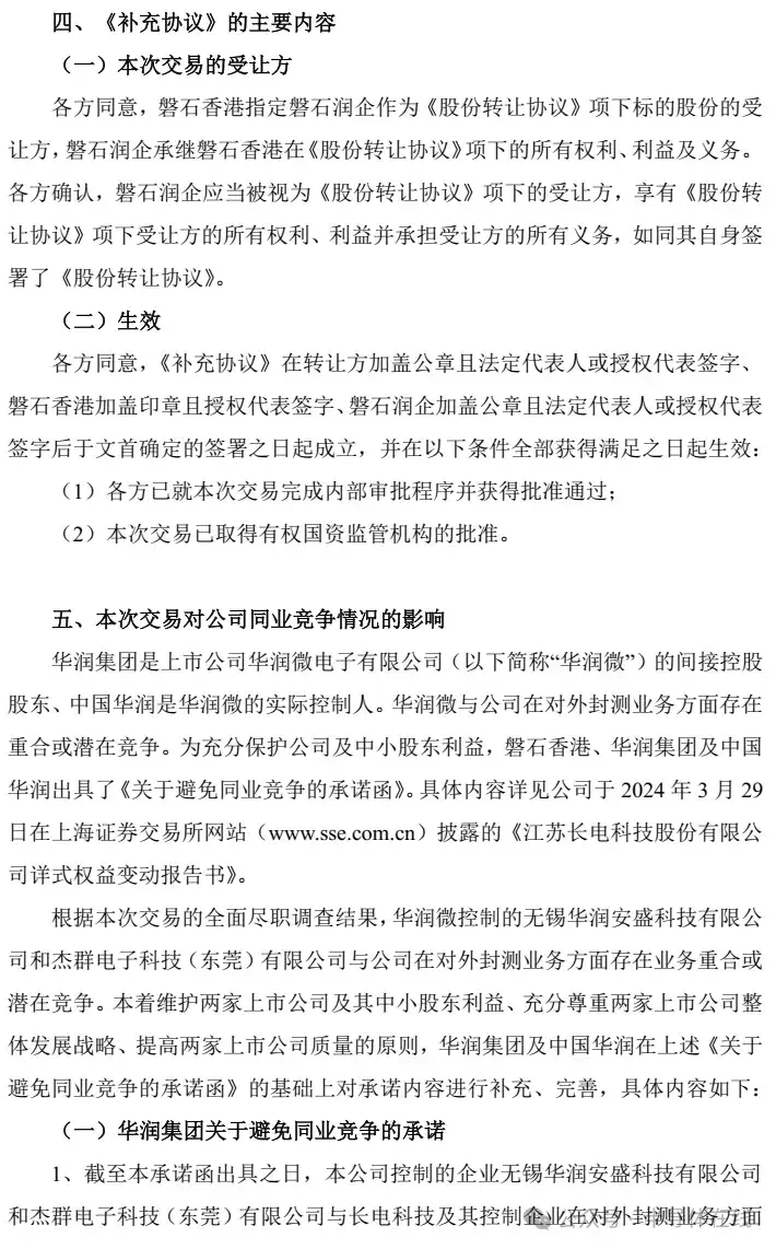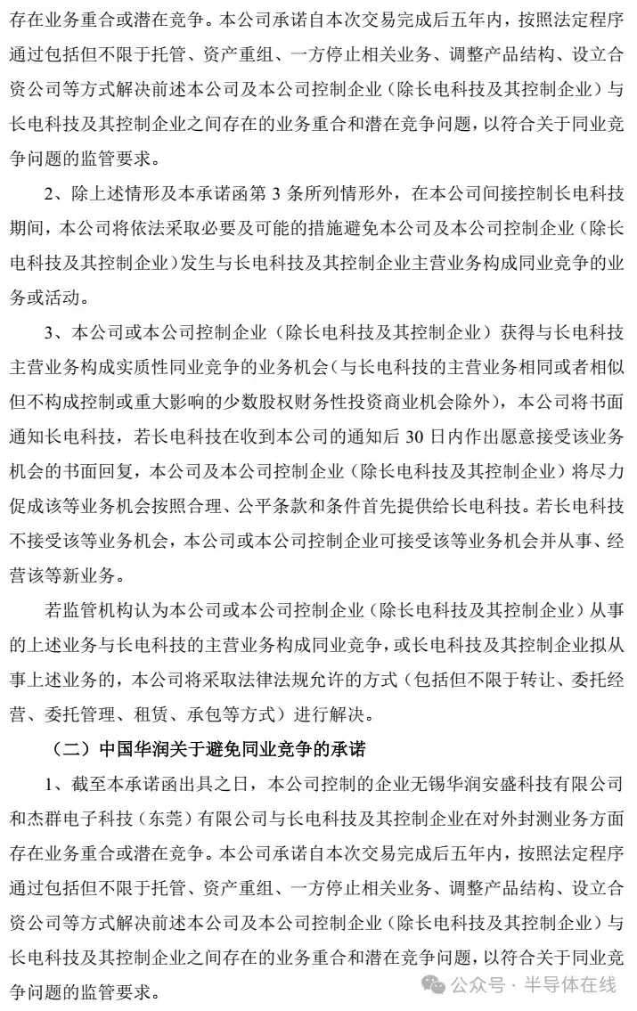 华润集团及中国华润承诺,在收购长电科技股份后五年内,将解决旗下企业(无锡华润安盛和杰群电子)与长电科技在对外封测业务的竞争问题,并避免未来发生同业竞争,确保长电科技及中小股东利益,通过托管、重组等方式解决现有竞争,并优先将新业务机会提供给长电科技。