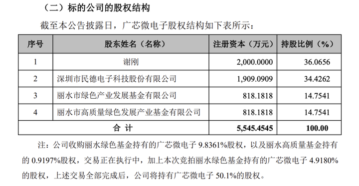 据了解,上述并购计划已通过民德电子董事会审议,尚须股东大会批准。民德电子分别于 2024 年 1 月 29 日与丽水绿色基金签订收购广芯微电子 9.8361%股权的转让协议、2024 年 4 月 17 日与丽水市高质量绿色发展产业基金有限公司(以下简称“丽水高质量基金”)签订收购广芯微电子 0.9197%股权的转让协议,
