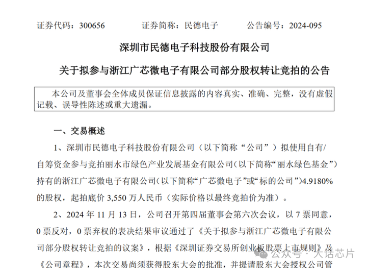 11月14日晚间,民德电子公告称,拟使用自有或自筹资金,参与竞拍丽水市绿色产业发展基金有限公司(下称“丽水绿色基金”)持有的浙江广芯微电子有限公司(下称“广芯微”)4.9180%的股权,起拍底价3550万人民币,实际价格以最终竞拍价为准。